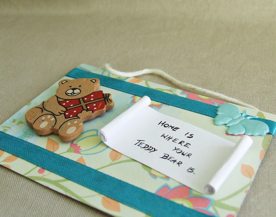 Teraz miś się nie zgubi, nie dostaną go koty, a będzie ładnie wyglądał na korkowej tablicy :)